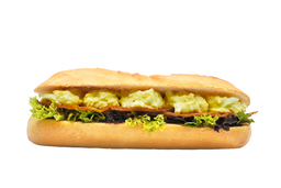 Broodje naar keuze belegd met met romige eiersalade met sla en crispy bacon.